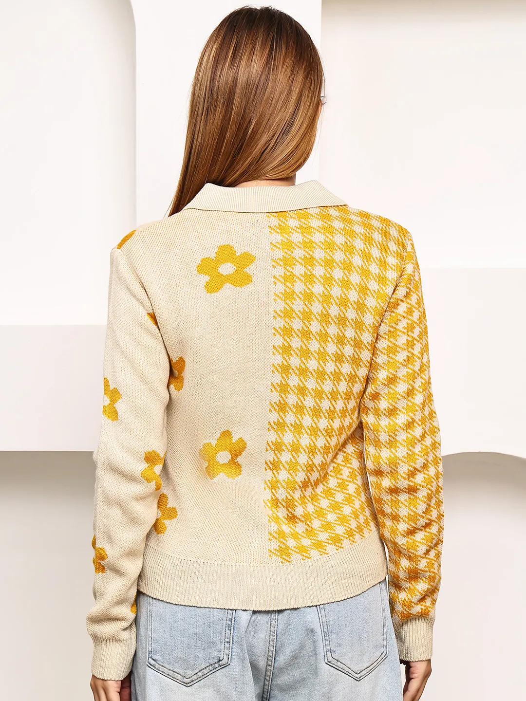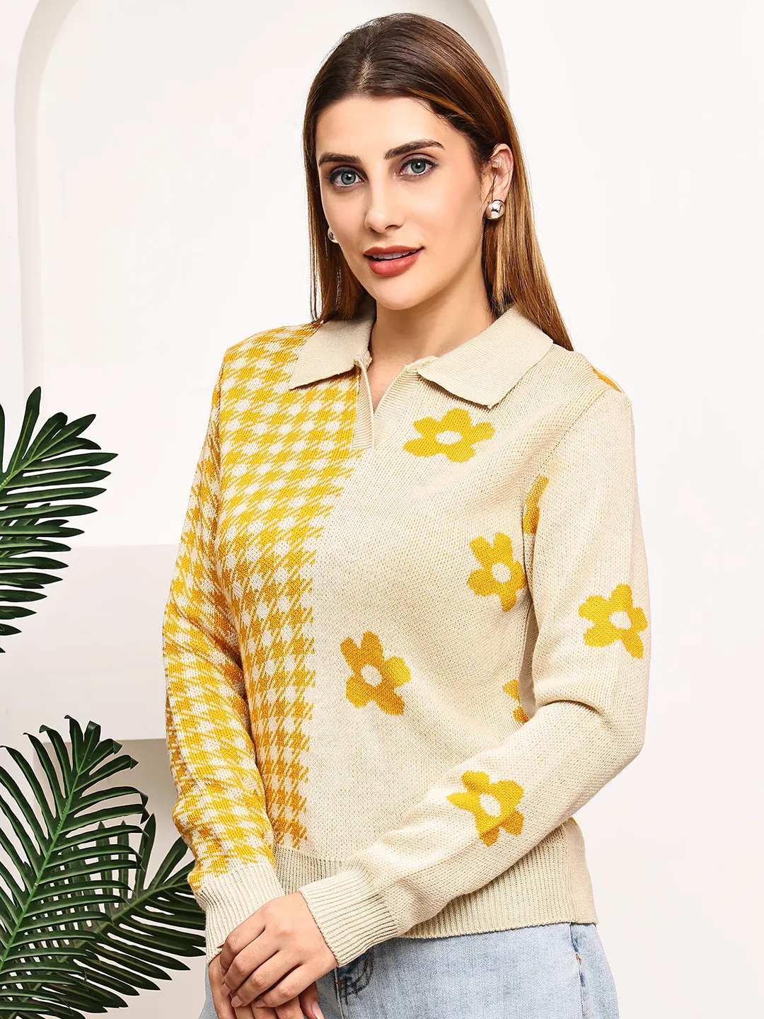 Beige & Mustard Floral Polo Sweater Top for Women – Jacquard Knit