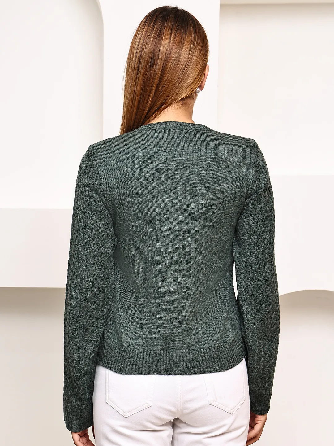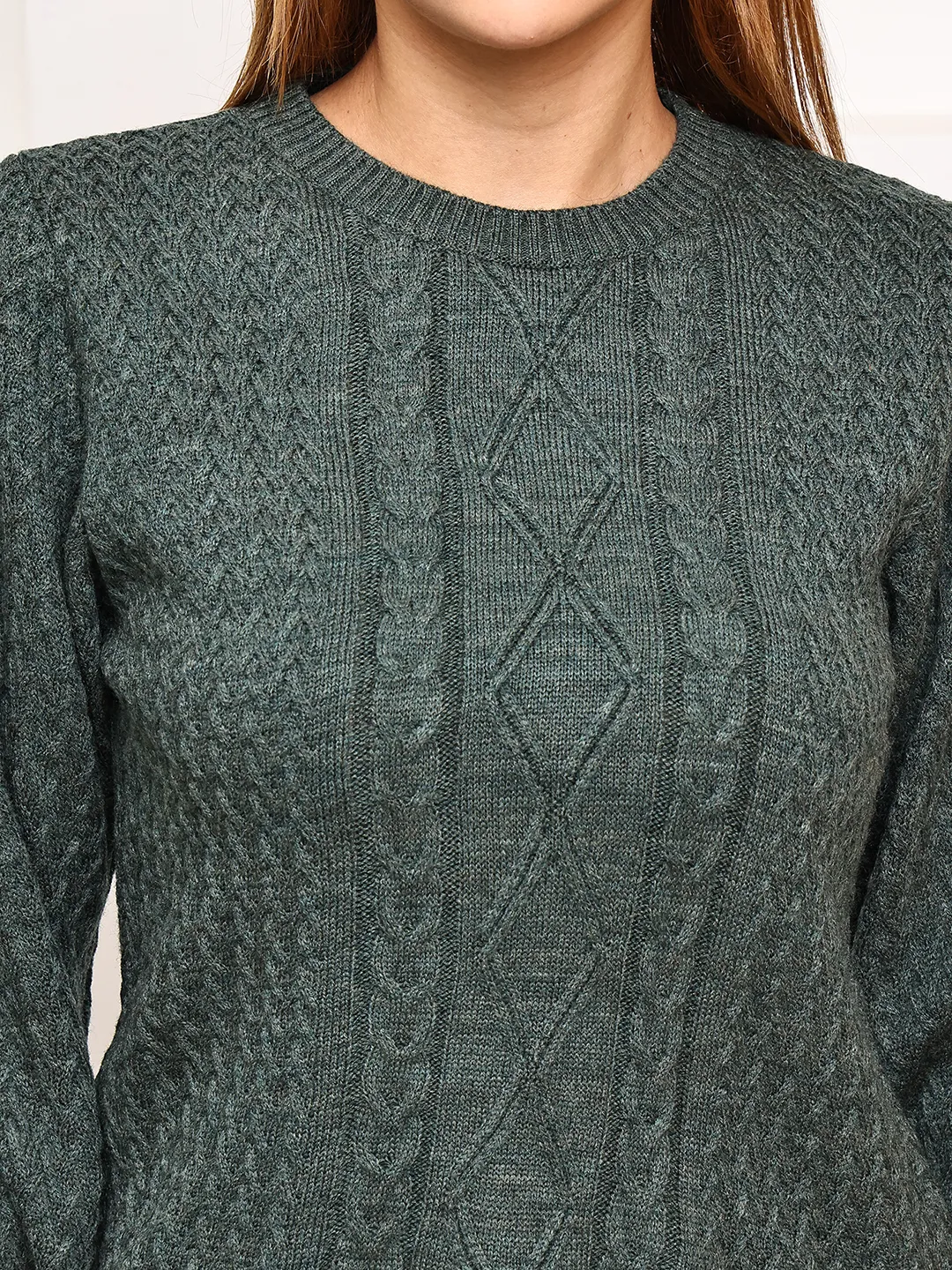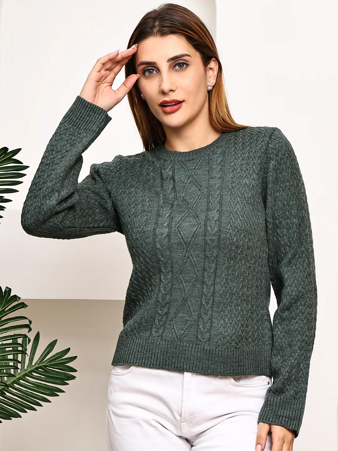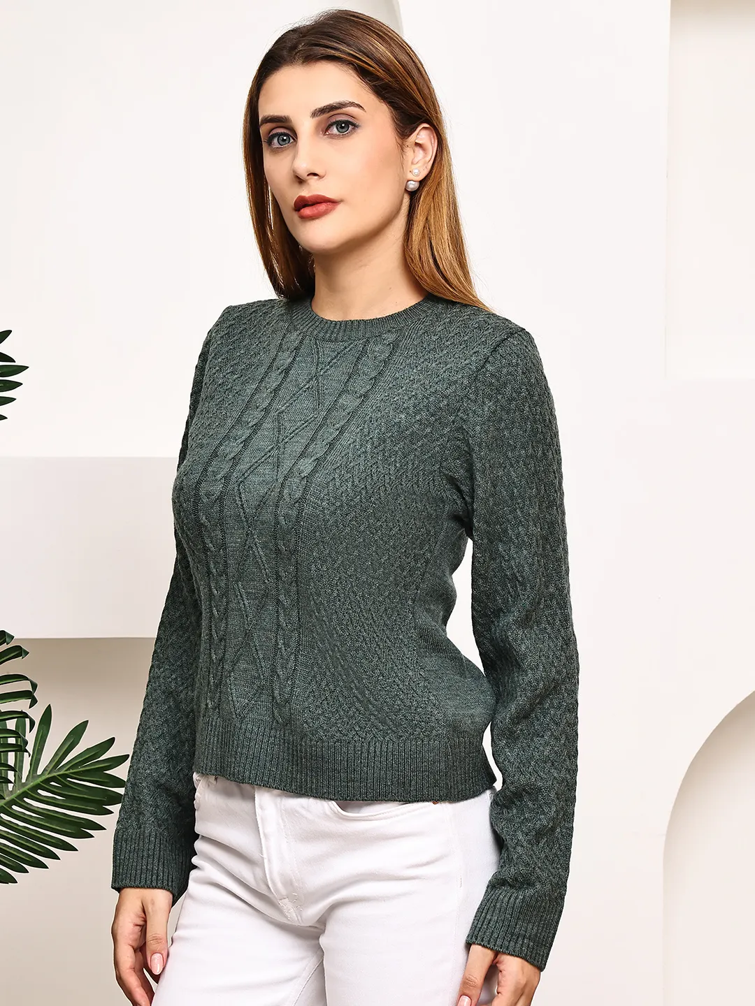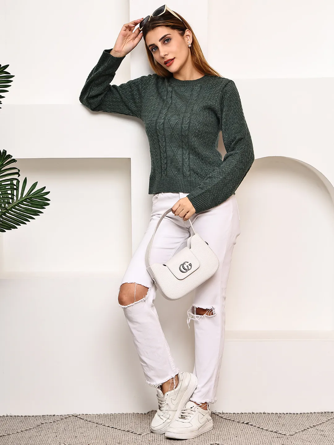 Elevate your wardrobe with this Dark Green Cable-Knit Round Neck Top, a timeless piece that blends comfort with classic style. Crafted from a soft, breathable knit fabric, this top features intricate cable detailing that adds texture and sophistication to any outfit. The round neckline offers a flattering, versatile silhouette that pairs effortlessly with jeans, skirts, or tailored trousers. Whether you’re dressing for a casual day out or layering for added warmth, this top delivers both style and functionality. Designed for a snug yet comfortable fit, it’s a must-have staple for the cooler seasons.