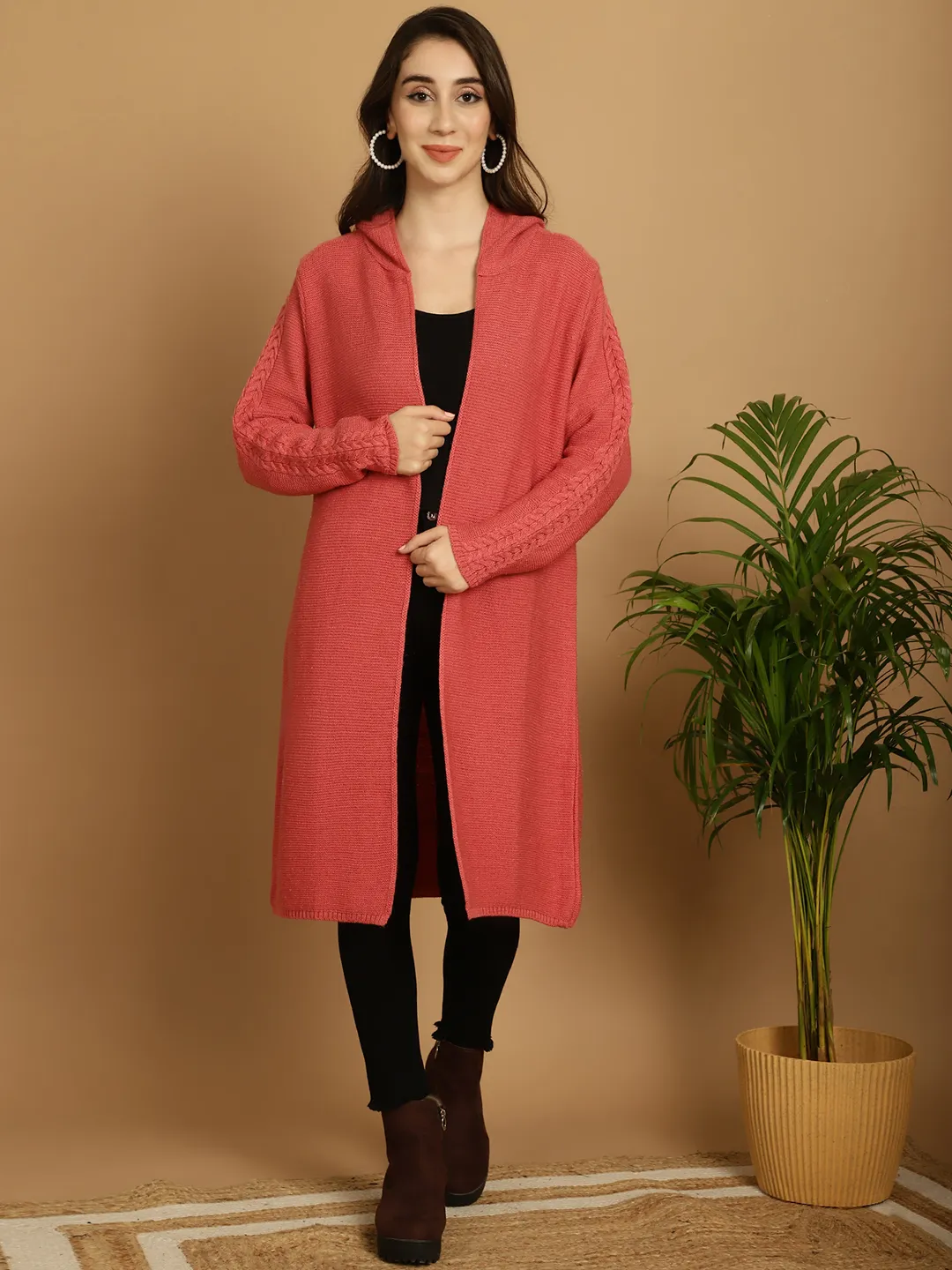 Wrap yourself in subtle elegance with the T7Apparels Dusty Peach Cable-Knit Hoodie Shrug. Crafted from soft, durable acrylic, this shrug combines warmth and feminine charm. The self-design cable knit texture adds visual interest, while the attached hood brings a relaxed, contemporary edge.