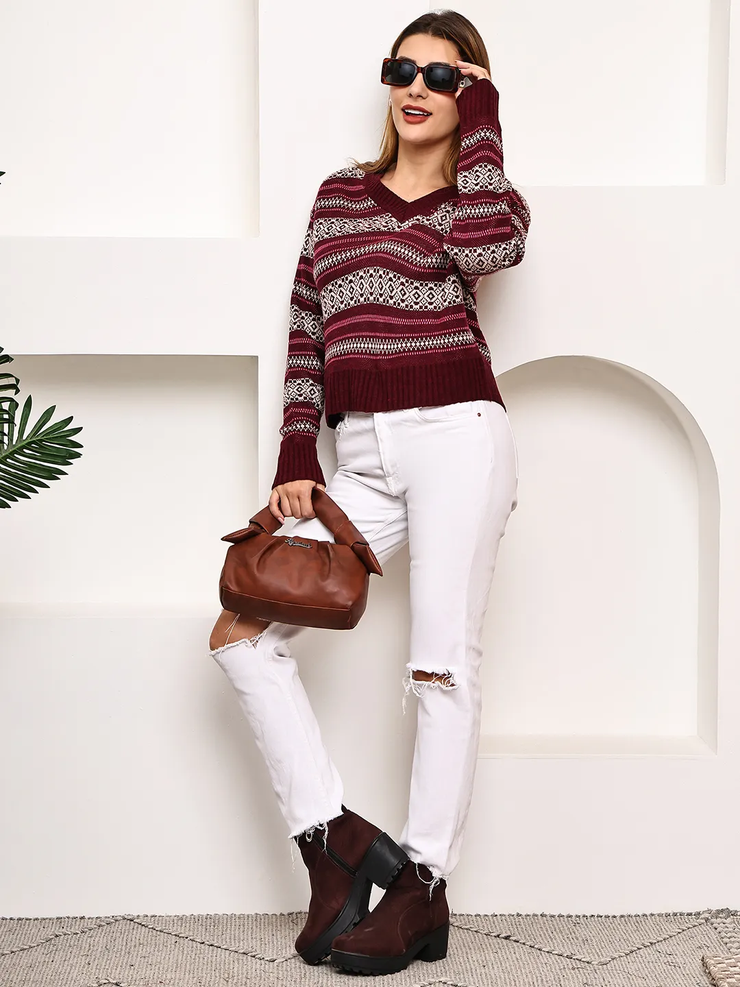 Maroon V-Neck Fair Isle Sweater for Women – Geometric Jacquard Knit
