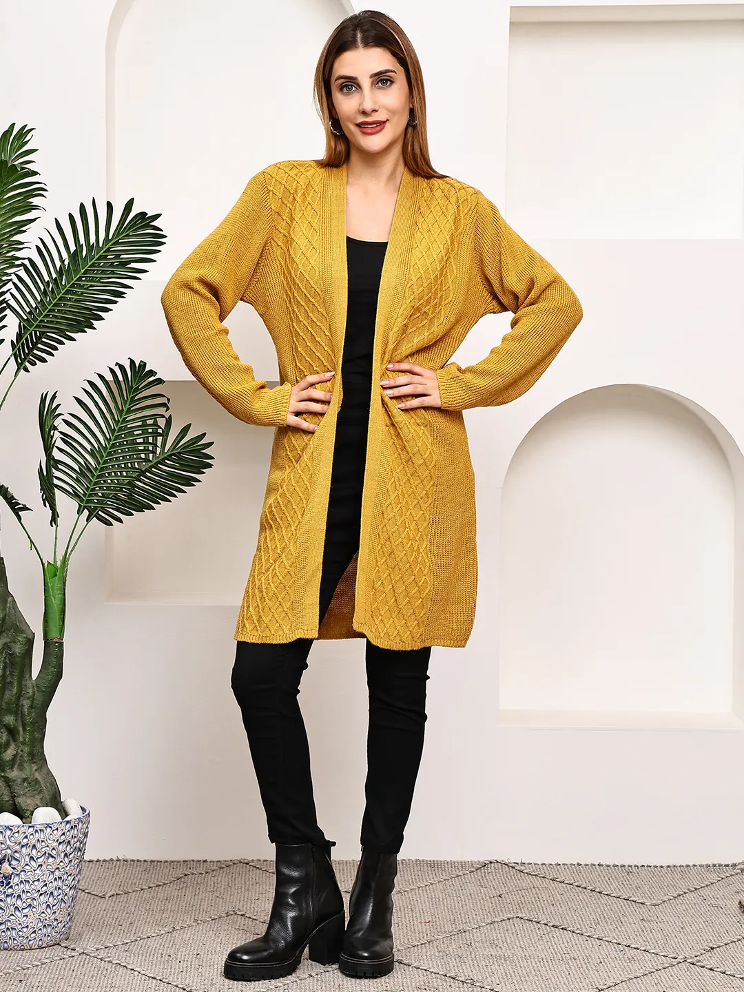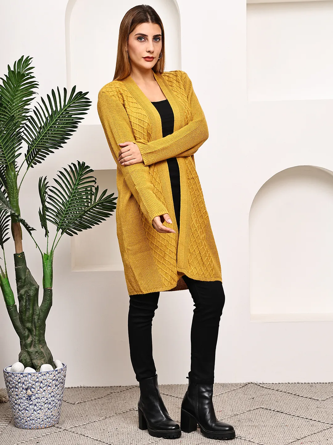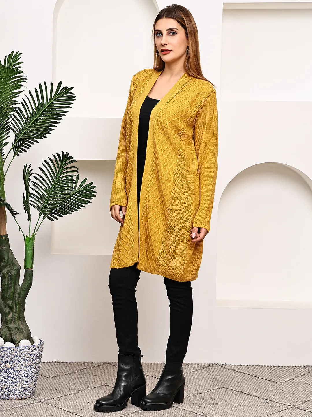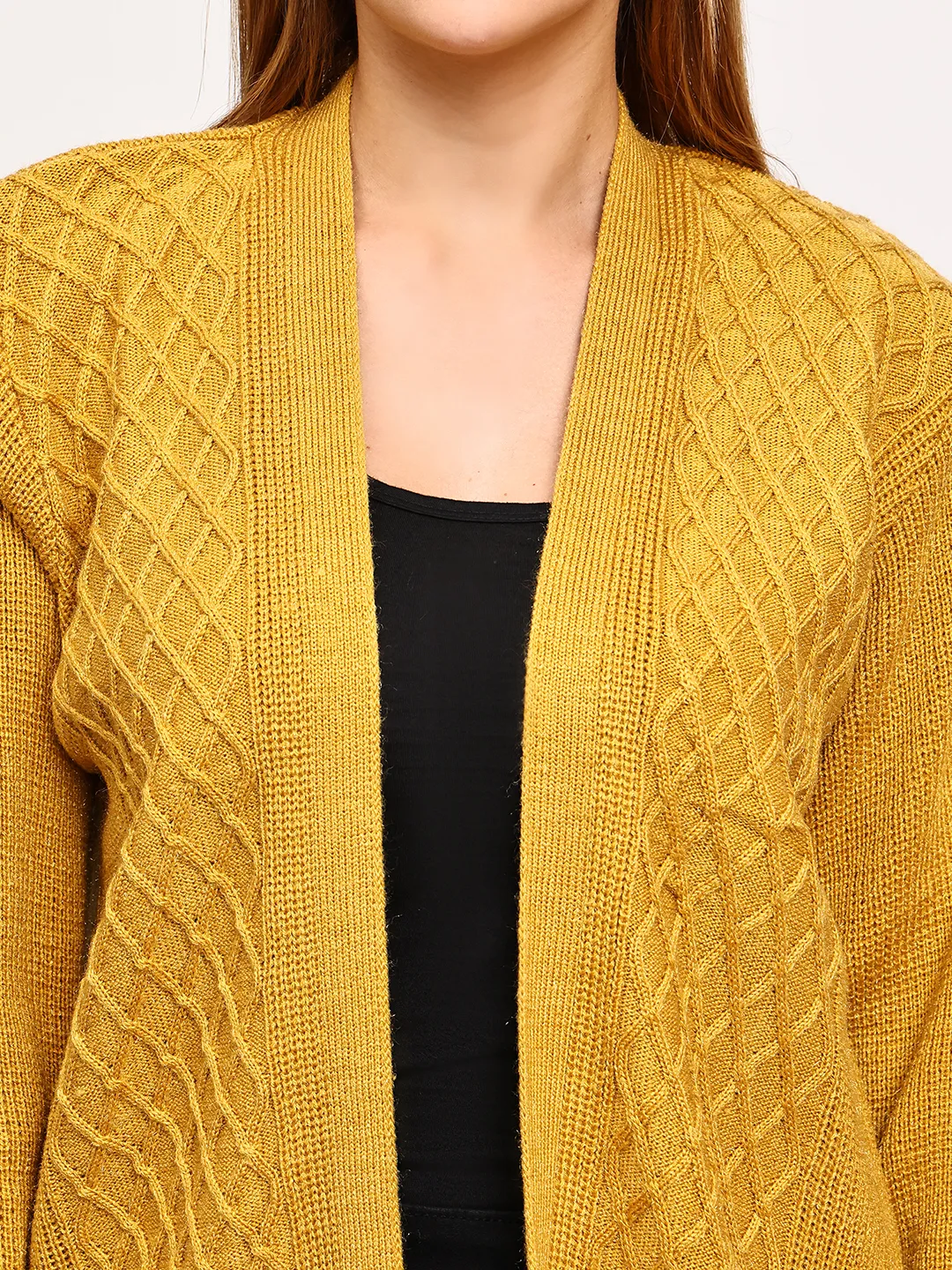 Brighten your winter style with this mustard cable-knit shrug from T7Apparels. Made of soft acrylic with a self-design pattern, it features long sleeves and a regular fit — the perfect blend of comfort and charm.
