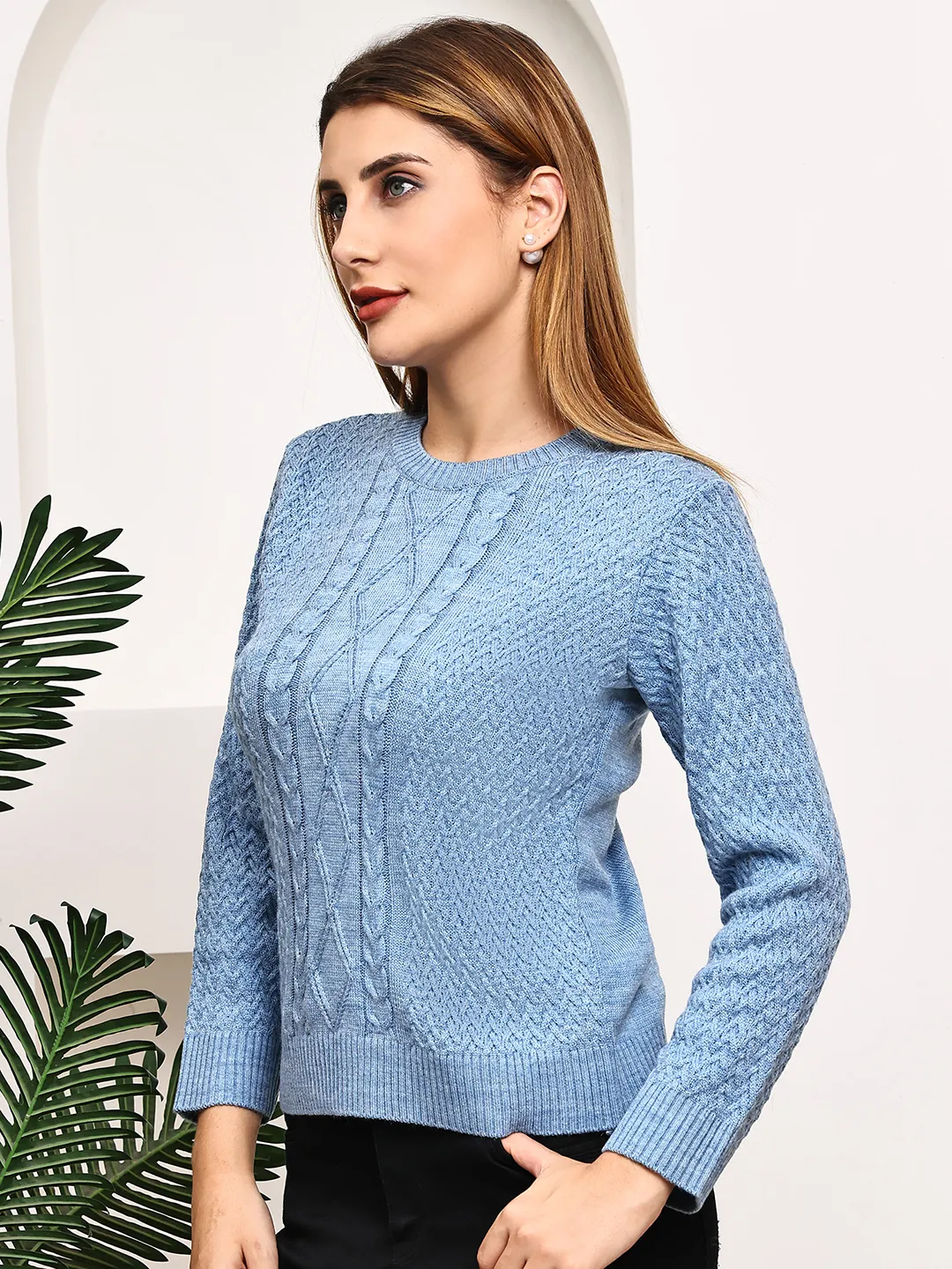 Refresh your wardrobe with this sky blue cable-knit round neck sweater for women. Crafted from soft acrylic with elegant self-design, it offers cozy warmth, timeless style, and easy care. Available in sizes S–2XL. Machine washable for everyday wear.