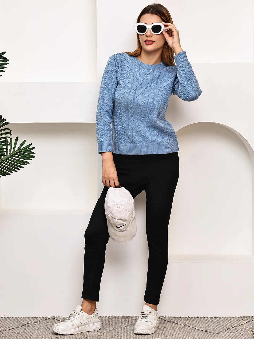 Bring effortless elegance to cool days with our Sky Blue Cable-Knit Round Neck Sweater Top for Women. Thoughtfully crafted to combine comfort, style, and versatility, it features: